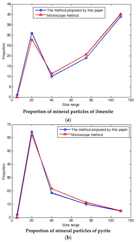 Proportion of mineral particles for (a) ilmenite and (b) pyrite.