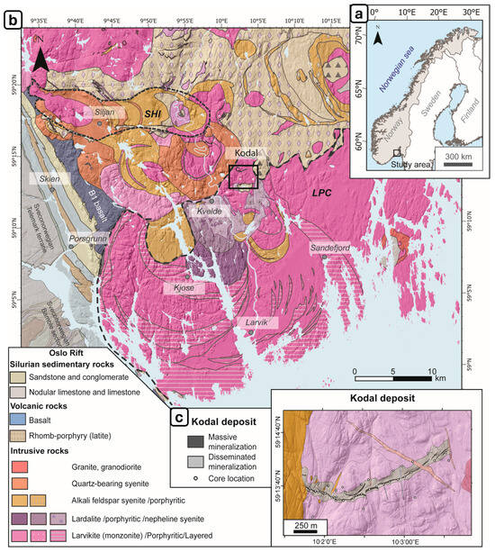 (a) The location of the study area in Norway; (b) simplified geologic map of the study area based on the 1:250,000 harmonized bedrock map of Norway which is published and maintained by Geological Survey of Norway; (c) the Kodal deposit.