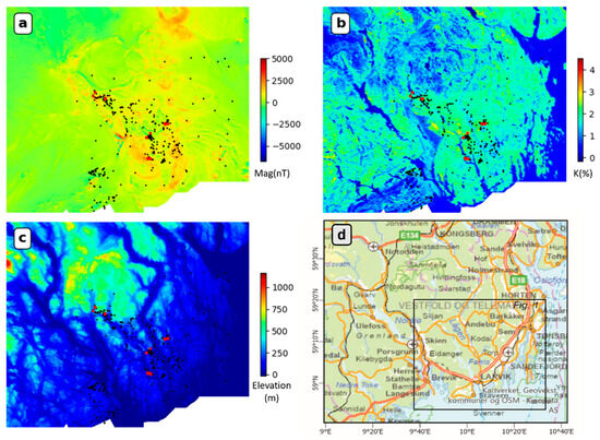 The high-resolution geospatial datasets projected onto a uniform grid with a 50 m cell size: (a) the total magnetic field anomaly (nT); (b) potassium (K) concentration (%); (c) topography (DEM) (m); (d) geography map to indicate the data coverage which is beyond the study region shown in Figure 1. Field sample locations are marked in (a–c) and differentiated using red dots to indicate mineralized samples and black dots to indicate non-mineralized samples.
