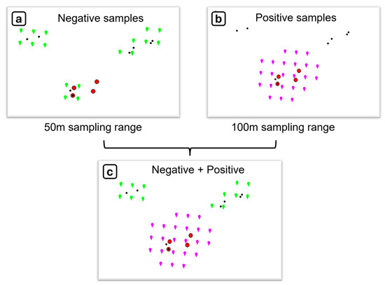 Illustration of the training data sampling strategy. The true locations of the non-mineralized (i.e., negative) and mineralized (i.e., positive) field samples are indicated by black dots and red circles, respectively. The green and magenta pointers correspond to the uniform grid (with a 50 m cell size) onto which the high-resolution spatial datasets are projected. Specifically, all the green pointers are located within a 50 m distance from at least one non-mineralized field sample (a); whereas all the magenta pointers are located within a 100 m from at least one mineralized sample (b); in cases of overlapping grid cells, the positive samples overrule the negative samples, as shown in (c).