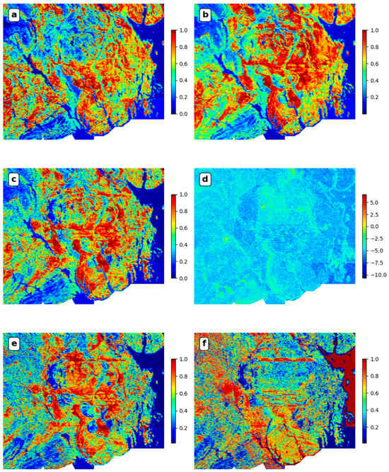 Predictive features corresponding to the airborne radiometric data. (a) K_ft; (b) Th_ft; (c) U_ft; (d) Th_K_as_ft; (e) U_K_ft; (f) U_Th_ft. The color bars associated with the feature plots indicate the relative data range and strength, but no physical units are provided. This is because the feature engineering process may have changed the scale or range of the original data, rendering the physical units no longer meaningful.