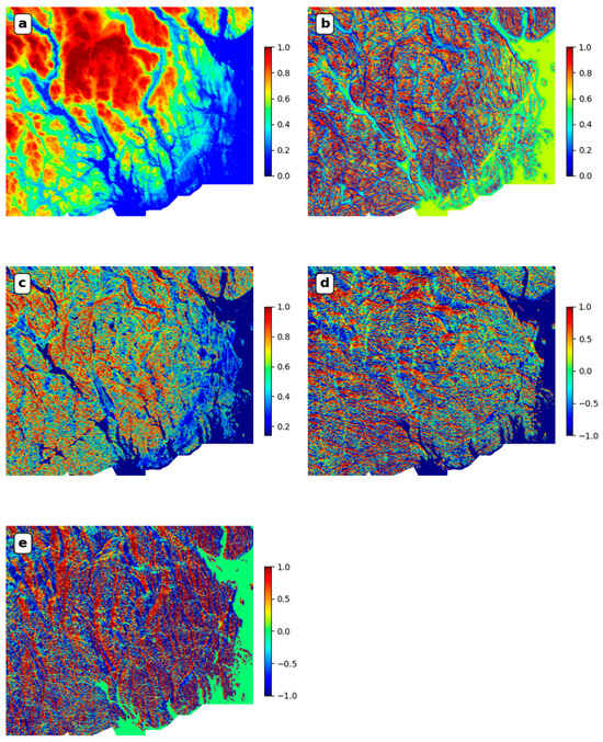 Predictive features corresponding to the topographic data. (a) Topo_ft; (b) Topo_vd_ft; (c) Topo_slope_ft; (d) Topo_aspect_sine_ft; (e) Topo_aspect_cosine_ft. The color bars associated with the feature plots indicate the relative data range and strength, but no physical units are provided. This is because the feature engineering process may have changed the scale or range of the original data, rendering the physical units no longer meaningful.