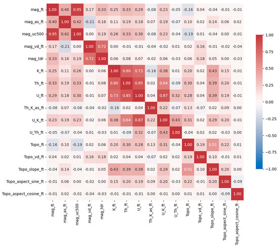 Correlation matrix among 16 candidate features including 5 magnetic features, 6 radiometric features, and 5 topographic features. The correlation coefficients range from −1 to +1, where −1 indicates a 100% negative correlation, +1 indicates a 100% positive correlation, and a value of 0 indicates no correlation.