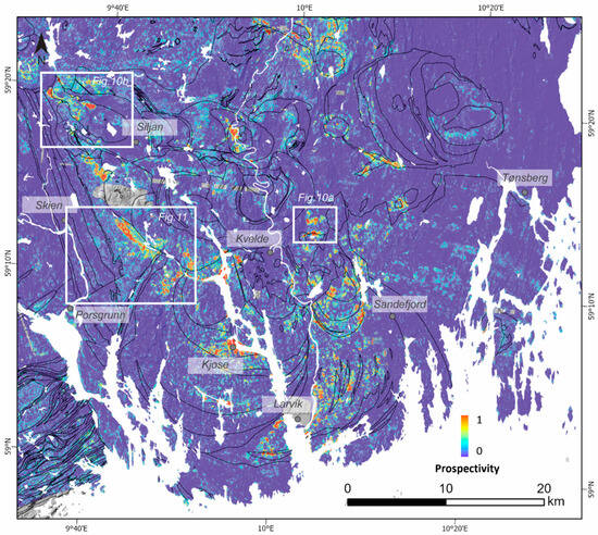 Regarding Teigen, the high prospectivity is related to the presence of two mineralized samples in the training dataset. However, the map does not predict the existence of larger mineralization in the nearby area. This information is crucial for planning future prospecting campaigns, as it helps us to focus efforts on areas with a higher likelihood of significant findings.