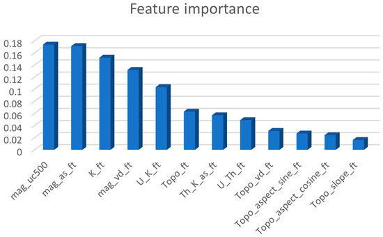Permutation feature importances [19] are computed to assess the importance of features in the trained RF model. These importances are quantified by assessing how much the model’s prediction error increases when the values of a particular predictor are randomly shuffled or permuted. In Figure 10, we show the feature importances in descending order, highlighting the most influential predictors. In general, the magnetic features and potassium (K) are the most important predictors for our model, while the topographic features are less influential. This is consistent with the domain knowledge described in Section 2.