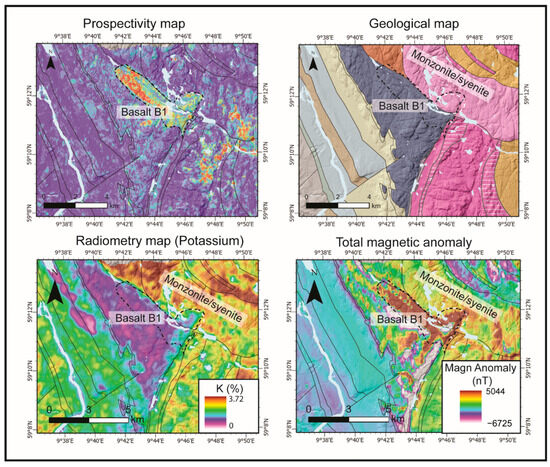 Comparison of the prospectivity map at the vicinity of the B1-basalt with the geology map, potassium (K) map, and total magnetic anomaly map.