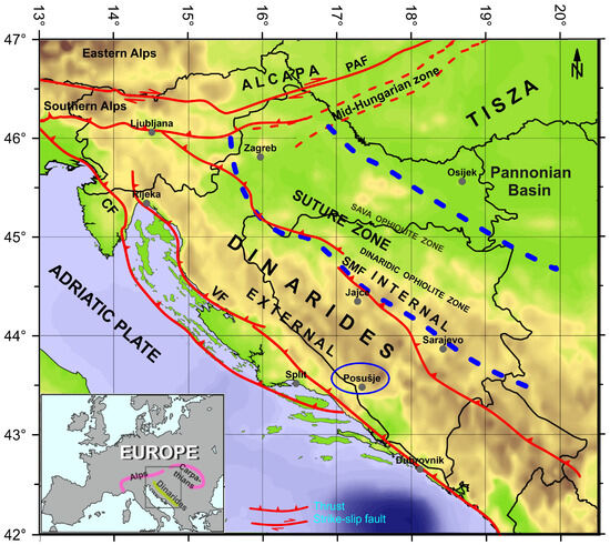 A coloured relief model of the Dinarides and marginal part of the Pannonian Basin with the border area of the Alcapa (Alpine–Carpathian tectonic unit). The main tectonic units and faults are superimposed on the topographic map (PAF—Periadriatic fault; CF—Ćićarija fault; VF—Velebit fault; SMF—south marginal fault of the Pannonian Basin). The suture zone (dashed blue line), which includes ophiolites zones, has been constructed following Šumanovac [14,19]. The survey area of Posušje belongs to the External Dinarides.