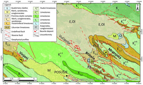 Most of the economically valuable deposits in the AdCP, such as the bauxite deposits in Posušje, were formed during the emersion phase between the Late Cretaceous and the Paleogene (so-called Paleogene bauxites), Figure 2. The deposits were formed on the paleokarst surface of Late Cretaceous Rudist limestones and have a thickness of more than 500 m. The largest and most numerous depressions in the paleorelief contain bauxite deposits formed due to the structural conditions prior to bauxitisation [2]. Bauxites often occur in wide zones of gentle antiforms, more precisely in their hinge zones, as these are the highest points of the anticlinal structure, characterised by fracture systems and, at the same time, most exposed to weathering [1,23]. In addition to these structures, bauxites also occur in the core of gentle synclines and along pre-bauxite faults [2].