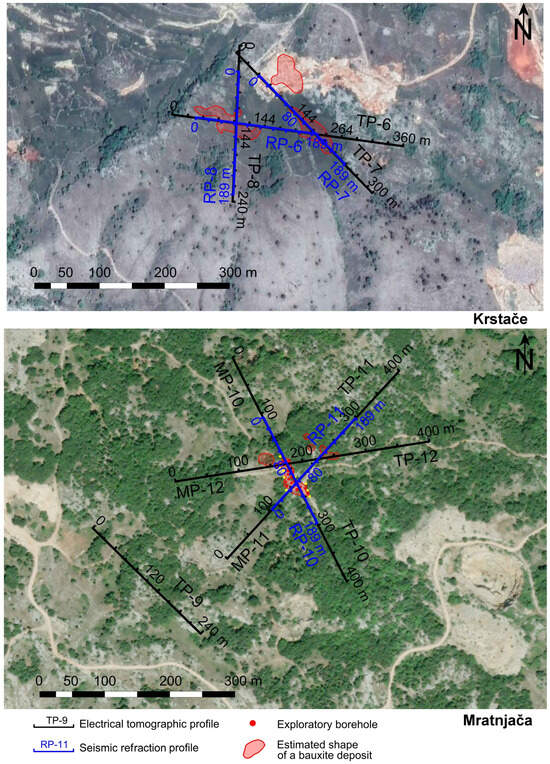 Recent developments in geophysical methods and measurement technology have given these investigations new dimensions and possibilities. However, the application of methods varies, and recognition of geological models and bauxite deposits in particular is very questionable. Ali et al. [28] utilised the ground radiometric method as a tool to delineate the surface boundaries of buried bauxite karsts. They mapped the depletion of radioactivity in the karst overburden and estimated the boundary of the bauxite karst based on the contour lines of the depletion anomaly. However, this type of research provides no information other than the delineation of potential bauxite-bearing zones at the surface. Orfanos et al. [11] conducted an extensive integrated geophysical study in the bauxite mines of Gerolekas in Greece, where the geological conditions are similar to those in the Posušje area, with the hanging wall and footwall of the bauxite deposits consisting of limestones, but with significantly deeper deposits. They used passive geophysical methods: local earthquake tomography (LET), gravity measurements for each of the 129 seismic stations and the magnetotelluric method at points of interest as well as data from more than 4000 boreholes. The authors emphasise that the geophysical parameters used in the modelling play an important role and must be as close to reality as possible, as they influence both the forward modelling and the inversion steps. They tried to show that a credible geological model can be provided which could indicate potential for future deep borehole survey as a further reconnaissance step towards additional mining operations in that area. Due to the limited resolution of the passive methods in the near-surface models, this methodologically complex and extensive type of investigation could not provide any new insights into the shallow and small pocket-like deposits as in the karst region of the Dinarides.