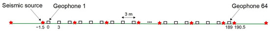At each seismic refraction profile, the measurements were made by registering the primary waves (P-waves) and were generated using a sledgehammer striking a metal plate on the ground. The seismic source was placed after every third geophone along the profile (Figure 4). Two seismic sources were placed at the ends at a distance of 1.5 m from the first and last geophones, and two were placed 6 m from the first and last geophones. Thus, there were 25 seismic source stations along the 189-metre-long refraction profiles.