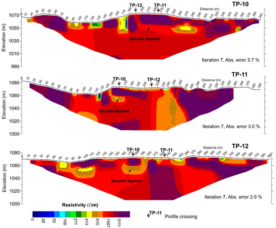 Tomographic measurements at all micro-locations show that bauxite deposits correlate with low-resistivity zones located below thin zones on high-resistivity surfaces. Zones with lower resistivities clearly stand out across all profiles in the area of Mratnjača. On the TP-10 tomographic profile, the outline of the deposit is located at a position of 180–250 m (Figure 5), and the low-resistivity zone caused by the deposit is located on the tomographic profile at a position of 190–290 m. However, at a position of 250–290 m, resistivity is less than in the rest of the zone; hence, it may be due to a fractured zone of carbonates that increases the low-resistivity zone and apparently increases the size of the bauxite deposit. On the other hand, larger deposit dimensions are also possible because there are no exploration wells in this area to confirm the existence or absence of bauxite. The TP-11 profile crosses the same bauxite deposit located at a position of 147–167 m, and in the inversion tomographic model, the narrow low-resistivity zone is located at a position of 145–170 m, all of which provides an excellent correlation (Figure 5). The same deposit is transversely intersected by the TP-11 profile and is located at a position of 155–180 m and provides a good correlation with the narrow low-resistivity zone on the tomographic profile at a position of 157–190 m (Figure 5). Second, the assumed small deposit located east of this large deposit, and not explored using wells, cannot be clearly detected in the tomographic models of the TP-11 and TP-12 profiles.