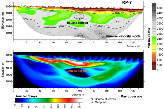 Inversion velocity model for the RP-7 refraction profile measured in the area of Krstače using the seismic ray coverage model. In the bauxite deposit, there is very poor ray coverage due to velocity inversion.
