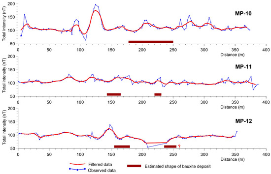 Magnetic profiles do not show any magnetic anomalies that might originate from bauxite deposits (Figure 9). Local variations in magnetisation intensities on profiles originate from surface inhomogeneities or non-geological objects, underground and above-ground steel objects and infrastructural objects. Again, it has been determined that there are no minerals in bauxite that increase its magneticity; hence, bauxite deposits are not found in magnetometric data as clear magnetic anomalies. Specifically, the main magnetic mineral is magnetite, and it can generally be said that its uneven distribution most often causes magnetic anomalies. Hematite, found in bauxite deposits, is most often not magnetic nor is limonite formed by hematite wear.