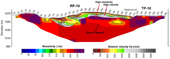 Folded inversion resistivity and velocity models for the TP-10 and RP-10 profiles in the area of Mratnjača. High velocities in Eocene limestones at the surface mask the action of the bauxite deposit with lower velocities below them—velocity inversion.