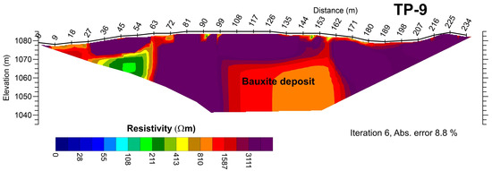 At the micro-location of Mratnjača-1 and based on some previous research, there are indications of the possible presence of a bauxite deposit; however, data and documentation were lost during the war, so accordingly, tomographic measurements were made on the TP-9 profile. The resistivity model clearly demonstrates the characteristic response from the bauxite deposit in the centre of the profile (Figure 11). On the surface at a position of 99–144 m, there are very high resistivities that indicate carbonate hanging wall rocks, Eocene rocks, which are relatively poorly fragmented. Below them, a zone of low resistivity can be observed at a position of 100–160 m, originating from bauxite deposits. In contrast, the resistivity in the Cretaceous carbonate substrate is expected to increase in the case of a larger depth intervention. The inversion resistivity model indicates larger dimensions of a deposit compared to roughly estimated limits based on recollections from previous studies. Unfortunately, refractive measurements could not be performed due to poor weather conditions, and subsequently, no additional drilling was conducted, but the deposit was immediately exploited for technological reasons.