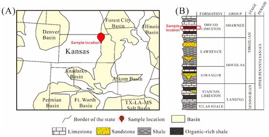 (A) Sample location in Kansas; (B) stratigraphic position of the Upper Pennsylvanian black shale studied.