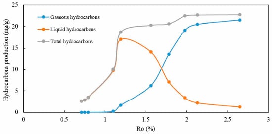 The results showed that the yield of hydrocarbons was closely related to the degree of pore development. The gaseous hydrocarbon yield had an extremely positive correlation with the volume of 0–2 nm pores (Figure 12A), representing micropore-level pores in organic matter produced by the generation and expulsion of small molecule hydrocarbons. Due to quality conservation, OM shrank to form macropores and fractures as the total hydrocarbon yield increased and 100–1000 nm pores increased (Figure 12B).
