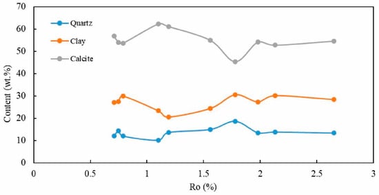 The samples were mainly composed of quartz, clay minerals and calcite, with the total amount of these three components being greater than 95% (Table 3). Calcite was the most dominant mineral at 45.4%–62.3%, followed by clay minerals at 20.6%–30.5% and quartz at 10.1%–18.7%. With the increase in thermal maturity, the calcite content first increased to the highest when Ro = 1.10%, then decreased to the lowest when Ro = 1.78%, and finally gradually increased. The trend of clay minerals content was opposite to that of calcite, and the quartz content is relatively stable (Figure 3).