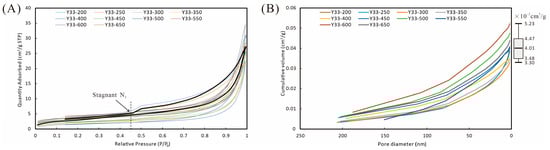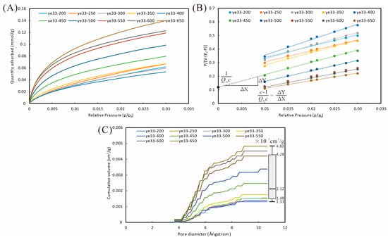 The CO2 adsorption capacity of 10 subsamples gradually increased with the relative pressure (P0/P), and the adsorption quantity was 0.054–0.140 mmol/g at P/P0 = 0.03 (P = 0.1 MPa), with ye33-650 (sample obtained from the artificial maturation experiment at a temperature of 650 °C) having the highest adsorption quantity (Figure 4A), according to the BET equation [12].