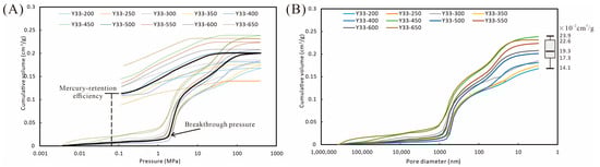 MIP has a wide pore-throat size characterization range [22,49]; the mercury intrusion curve increases slowly at pressures less than 1 MPa, the mercury intrusion volume increases rapidly when the pressure is higher than the breakthrough pressure, and then the mercury intrusion rate slows down as the pressure increases (Figure 6A). The maximum mercury intrusion volume of the samples varied widely, from 0.141 to 0.239 cm3/g. The mercury-extrusion curves were flat at high pressure (>40 MPa), followed by rapid mercury discharge from the sample. After the pressure was reduced to atmospheric pressure (101 kPa), there was still a large amount of mercury that could not be discharged, and the mercury retention efficiency was as large as 55.5%–74.8% (Table 3). The high mercury retention efficiency represents mercury retained in shale samples with poor sample pore connectivity and a large number of single-channel pores. The cumulative pore volumes of 3 nm–300 µm pore-throat sizes were calculated (Figure 6B) based on the Young–Dupre equation, the Washburn equation and the cylindrical pore assumption [39], but the irreversible destruction of pores by high-pressure intrusion may lead to the destruction of tiny pores and unreliable results less than 50 nm.