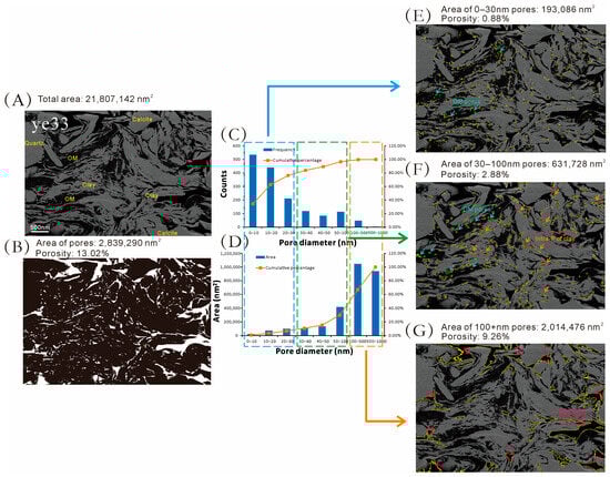 (A) SEM image of the ye33 sample; (B) Binarized images for pore recognition; (C) Distribution of pore counts by statistics from (B); (D) distribution of pore volume by statistics from (B); (E) Features of pores in 0–30 nm, (F) Features of pores in 30–100 nm and (G) Features of pores in 100+ nm.