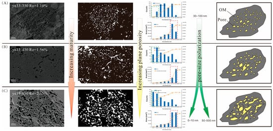 OM pores are formed inside or around OM during thermal maturation due to mass and density reduction and volume contraction in the process of hydrocarbon generation [50,51]. The gas genetic pores inside OM were round and elliptical in the image. Through comparative analyses of OM pore recognition results of samples with different maturities (Figure 8), under the same magnification, it was found that when Ro = 1.1%, the number of intra-OM pores mainly existed in two peaks of 30–40 nm and 50–100 nm in diameters, and the most pore volume was provided by 50–100 nm pores (accounting for 44.62%). A total of 672 pores were recognized, and the plane porosity was 5.67% (Figure 8A). When Ro increased to 1.56%, more tiny OM pores were generated, and the number peaks shifted down to 10–20 nm and 50–100 nm, respectively, while the most pore volume was provided by 100–500 nm pores (accounting for 59.34%). In addition, a total of 910 pores were recognized, and the plane porosity was 9.57% (Figure 8B). When Ro was further increased to 2.65%, some pores continued to expand and connect together, the number peaks changed to 0–10 nm and 50–100 nm, and its main pore volume was provided by 50–500 nm pores (accounting for 72.25%). Furthermore, a total of 514 pores were recognized, and the total plane porosity was 18.21% (Figure 8C). As a whole, the plane porosity of the intra-OM pores increases with an increasing maturity, generating more micropores and mesopores. Adjacent gas genetic pores were interconnected and merged into larger pores while generating more tiny pores in residual organic matter. These two effects cause polarization in the pore-size distribution of organic matter.