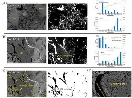 (A) Characterization and distribution of the pores of the ye33-450 sample in a large field of view; (B) Characterization and distribution of the pores of the ye33-650 sample in a large field of view; (C) Recognition results and features of the 100+ nm pores of the ye33-650 sample; (D) Spongy OM pores and perimeter shrinkage fracture of the ye33-650 sample.