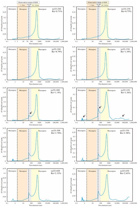 Pore-size volume distribution of subsamples with different maturities. (Arrows represent new peaks generated compared to the previous stage).