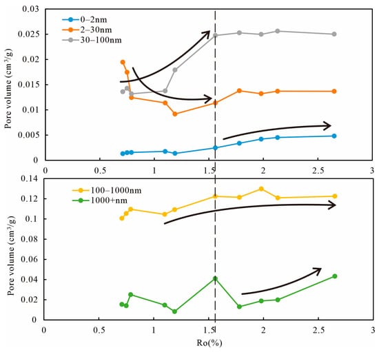 Evolution of pore volume at different pore scales. (Arrows indicate the trend of pore volume variation with maturity at different scales).