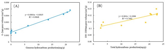 (A) Correlation between 0–2 nm pores and the yield of gaseous hydrocarbons; (B) correlation between 100–1000 nm pores and the yield of total hydrocarbons.