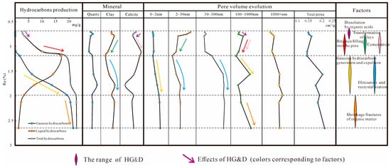 Based on the characteristics of HG&D and pore evolution, the evolution of organic-rich shale was divided into the following three stages (Figure 13):