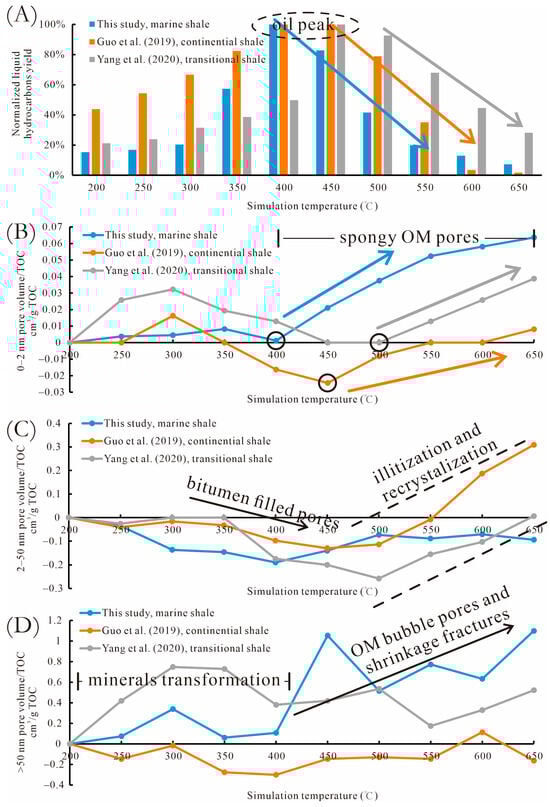 Comparison of thermal simulation results for marine, continental and transitional shales (A) variation of normalized liquid hydrocarbon yield with simulation temperature (at oil peak, normalized liquid hydrocarbon yield = 1); (B) variation of 0–2 nm pore volume with simulation temperature; (C) variation of 2–50 nm pore volume with simulation temperature; (D) variation of >50 nm pore volume with simulation temperature [29,36].