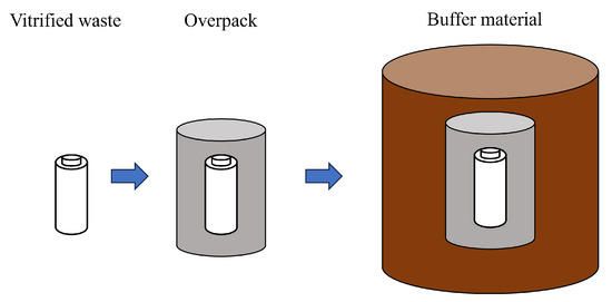 Because of the high radioactivity level of HLW, a disposal method that isolates HLW from the human living environment until its toxicity declines is required. The isolation period is expected to be tens of thousands to hundreds of thousands of years, so the disposal method must be one that does not require human control. The current disposal method is called “geological disposal” [1]. In Japan, this method involves enclosing the waste in a multi-layered barrier system and burying it at a depth of 300 m or more below the surface. The multi-barrier system consists of a natural barrier composed of host rock and engineered barriers composed of vitrified waste, overpack (metal container), and buffer material. Figure 1 shows a conceptual diagram of the engineered barrier system. The roles of the components of engineered barriers are described. The role of vitrified waste is to confine radionuclides for a long period of time by taking advantage of the water insolubility of glass [1]. The role of the overpack is to prevent contact for at least 1000 years between the vitrified waste and groundwater until the radioactivity of the vitrified waste has decayed to some extent [1]. The main functions required of buffer materials are stress buffering, chemical buffering, water sealing, sorption of radionuclides, and thermal conductivity [1]. Stress buffering protects the overpack from stress from the bedrock. Chemical buffering prevents significant changes in the pH and chemical composition of the porewater. Water sealing delays the approach of radionuclides leached into groundwater to the human living environment. Radionuclide sorption delays the migration of radionuclides by allowing them to sorb onto the buffer material. Thermal conductivity suppresses the temperature rise of the vitrified product. This study focuses on the buffer material.