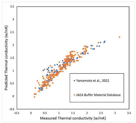 The effect of cations in the interlayer of montmorillonite on thermal conductivity is considered to be small. Therefore, Ca-bentonite was also included in the analysis. In addition, the change in thermal conductivity due to salinity is small [3]. From the above, in the regression analysis, previously, the measured thermal conductivity of bentonite was used [4,5], and the parameters were organized in terms of temperature , water saturation , bentonite content in the buffer material , and dry density . Although the experimental temperature is not given in the Nuclear Waste Management Organization of Japan (NUMO) as measurement data [4], it was calculated assuming a room temperature of 23 °C. The empirical equation by regression analysis is shown below.