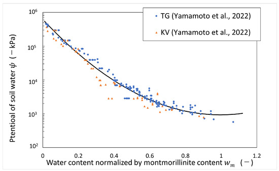 Data on the measured potential of soil water of bentonite in deionized water and artificial seawater (ionic strength of 0.64 M) have been published [4]. The data were obtained from the measurements of the vapor pressure method and psychrometer method. The water potential of soil water in deionized water can be regarded as the same as the matric potential, which is shown in Figure 6, organized by water content normalized by montmorillonite content. The vertical axis shows the potential of soil water at negative pressure, and the horizontal axis shows water content normalized by montmorillonite content. The test was carried out at room temperature (around 20 °C). In this analysis, the temperature was assumed to be 20 °C. From Figure 6, an empirical equation for the matric potential was derived as follows.