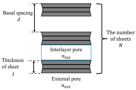 The relationship between the basal spacing d, the thickness of sheet t, and the number of sheets N is shown in Figure 8. According to Kijima et al. [30], for Na-montmorillonite; therefore, is used in this paper.