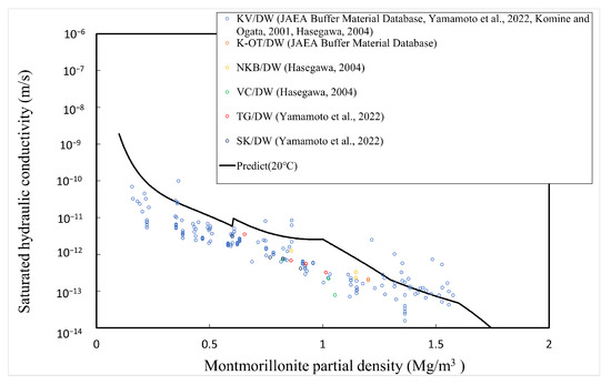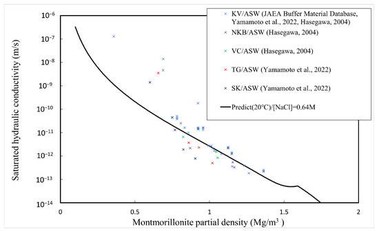 Figure 11, Figure 12 and Figure 13 show that the predicted values of hydraulic conductivity are slightly higher than the measured values for pure water and Horonobe groundwater on the whole, while, as shown in Figure 12 and Figure 13, under Horonobe groundwater and artificial seawater conditions, the predicted hydraulic conductivities are slightly smaller than the measured ones in the low-density region. Since there is not a large amount of measured data for hydraulic conductivity in the low-density region under saline water conditions in this comparison, it is necessary to verify the extent of the deviation from the analytical values using more data. However, in all cases, the predicted values are generally consistent with the measured values over the montmorillonite partial density.