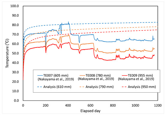 Comparisons between the measured and analyzed values for the degree of saturation and temperature distribution are shown in Figure 14 and Figure 15, respectively. The figures in parentheses in both figures represent the radial distance from the center of the waste body. The degree of saturation of the measured values was converted from the cyclometer measurements [15].
