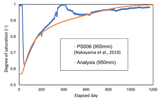 Figure 14 shows that the comparison with the measured results of temperature is limited. In the analysis, although the surface temperature of the overpack was set at 90 °C, the measured values rose and significantly fell due to the changes in the temperature setting in the test, such as the effect of power outage. Therefore, this analysis does not reflect the changes in the temperature setting in the in situ test in the analytical conditions. This is assumed to be one of the causes of discrepancy from the measured values. The play between the overpack and the buffer material was not taken into account in the analytical conditions, and it can be assumed that the deviation from the measured values was large for the period up to 200 days because this play prevented heat from being transferred to the buffer material. In addition, the adiabatic condition was adopted as the boundary condition in this paper. Under these conditions, cooling by heat dissipation has not been considered. Therefore, it is necessary to consider the setting of the dissipation term (cooling term).