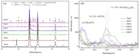 The XRD patterns of samples of Fe2O3, CaCO3, and Al2O3 reacted for 60 min at different temperatures lower than 1200 °C are shown in Figure 2a. It can be seen that CaCO3 corresponding to PDF 5-586 decomposed completely at 900 °C after sintering for 60min, while CaO corresponding to PDF 37-1497 had also not appeared, which indicates that the CaO had already participated in the reaction to generate other products. As the temperature increased to 1100 °C, Ca2Fe2O5 (C2F) corresponding to PDF 47-1744, CFA (Ca3.18Fe15.48Al1.34O28) corresponding to PDF 52-1258, and CF corresponding to PDF 32-168 successively appeared. However, it can easily be seen that the diffraction peak intensity of CF decreased, while the diffraction peak intensity of CFA and Ca2Fe15.5O25 corresponding to PDF 78-1669 increased when the temperature increased to 1200 °C. In more detail, for diffraction angles ranging from 33.5° to 35.4°, as shown in Figure 2b, the first strong peaks of CF (3 2 0), CFA (0 -2 4), and Ca2Fe15.5O25 (1 1 18) clearly exited, and this phenomenon had already appeared above 1000 °C. Amazingly, the diffraction peak of CaO (2 0 0) appeared at 1200 °C, corresponding to the first strong peak, as shown in Figure 2a. According to above result, it can be considered that CF transformed to Ca2Fe15.5O25 and CFA at 1200 °C, as follows:
