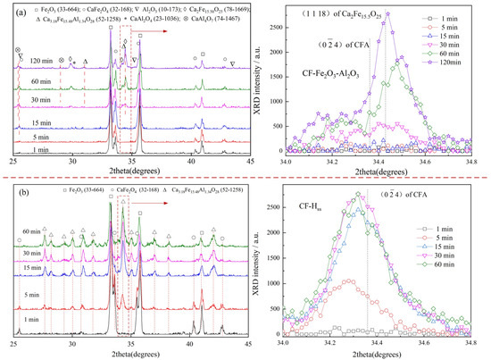 XRD patterns of samples for reactions of CF, respectively, with mixtures of Fe2O3-Al2O3 (a) and Hss (b) for different durations at 1200 °C.