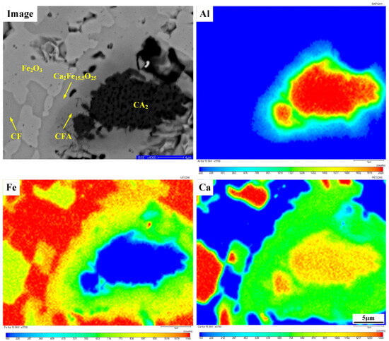 As shown in Figure 4b, similarly, the phases CA2, CFA, Ca2Fe15.50O25, and Fe2O3 can be confirmed through the EDS results and XRD patterns. It can be seen that there was a clear layering structure in order of CA2, CFA, Ca2Fe15.50O25, and Fe2O3, where Al2O3 disappeared. To further confirm this result, it was characterized by EPMA, and the corresponding image and Al, Fe, and Ca mappings are shown in Figure 5. The Al, Fe, and Ca elements were distributed around the CA2, corresponding to CFA, Ca2Fe15.50O25, and Fe2O3, respectively, which is consistent with the result in Figure 4b. This can be seen in the result of Reactions (1), (2), and (4), in which Al2O3 reacted with CaO after Reaction (2) to generate calcium aluminum oxide (CA or CA2) as follows: