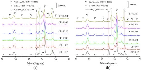 Ca2Fe15.50O25 is the product of Reaction (1) according to the XRD result, in which there is some doubt in the chemical composition. Karpinskii et al. reported several similar formulas like Ca2Fe15.51O25 (PDF 78-2301), Ca2Fe15.50O25 (PDF 78-1669), and Ca2.5Fe15.5O25 (PDF 79-440) as rhombohedral structures [29,30], and simultaneously reported Ca2Fe15.6O25 (PDF 78-1184) and Ca2Fe15.588O25 (PDF 78-1675) as hexagonal structures, two crystal structures that are also very similar [31]. These seem very difficult to understand with regard to experimental accuracy. For this reason, the chemical composition was verified by using the CF-Fe2O3 (CF-F) sample sintered at 1200 °C, respectively, for 5 h and 10 h in air by changing the Fe2O3 content. The XRD patterns of the CF-F samples are shown in Figure 6, indicating only Ca2Fe15.50O25 as a product at 1200 °C for 5 h and 10 h. In addition, it was observed that for 5h, the amount of CF in the samples increased with the increase in mole ratio of CF to Fe2O3 in the raw materials, as shown in Figure 6a. After sintering for 10 h, as shown in Figure 6b, the CF and Fe2O3 in the samples simultaneously disappeared when the mole ratio of CF to Fe2O3 in the raw materials was 1: 0.98, and the Ca2Fe15.50O25 formed completely. This indicates the formula corresponding to Ca2Fe15.50O25 should be CaFe3.96O6.94 (CF1.98), similar to the chemical composition of CaFe4O7. If the Ca2Fe15.50O25 as crystal structure is true, there will be a lot of Fe3+ and O2− vacancies in CF1.98, which is beneficial for its internal diffusion.