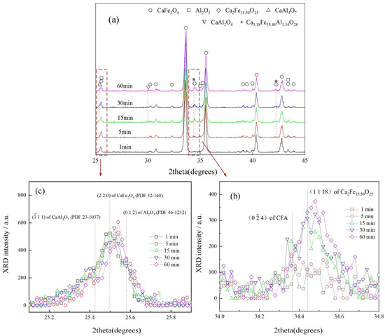To further verify Reaction (2) with the CF-4%Al2O3 sample sintered at 1200 °C for different durations, the XRD patterns are shown in Figure 8. It can be seen that Ca2Fe15.50O25, CaAl2O4, CaAl4O7, and a little CFA were products of sintering process in which the CaAl2O4 transformed to CaAl4O7, and disappeared for 60min; simultaneously, the Ca2Fe15.50O25 increased with time, while the CF decreased. The result is consistent with Reaction (2); the diffraction peak intensities of Ca2Fe15.50O25 and CFA in the CF-Al2O3 sample, as shown in Figure 8b, are clearly inferior to those in the CF-Fe2O3-Al2O3 sample. As shown in Figure 3, the Fe2O3 could act as a conductive layer of Al3+; instead, the Al2O3 captured Ca2+ from the CF to generate CA and CA2. It can be considered that the CA or CA2 was determined by the activity of Ca2+(or CaO) at the interface between the Al2O3 and CF, but CaO was not observed as it was in the CF-Fe2O3-Al2O3 sample. This further revealed that the appearance of CA or CA2 is a main reason to decrease the rate of CFA formation.