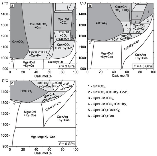 In the low-temperature part of the T-X diagrams, the Carb+Ky+Coe fields appear (the unshaded fields in Figure 1). Their shape follows that of the corresponding fields on the CaCO3-MgCO3 T-X diagrams. As can be seen, the Carb+Ky+Coe fields do not have a common boundary with the Grt+CO2 fields, only point contacts at Ca# 0, 20–30, and 100. For the remaining compositions, the Carb+Ky+Coe and Grt+CO2 fields are separated by the Grt+CO2+Cal+Ky+Coe/Cpx fields.