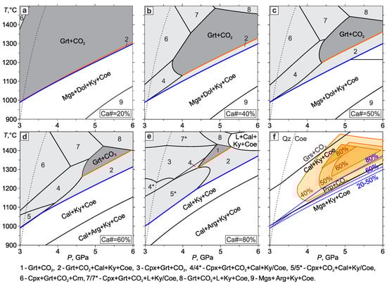 In the range of Ca# from 20 to 50, the full carbonation line does not change its position and experiences a slight upward shift as the Ca# increases to 60–80 (Figure 2f). At Ca# 20 and less, the lines of partial and full carbonation almost coincide. As the Ca# increases from 20 to 80, the partial carbonation line (orange in Figure 2) shifts upward, widening the region of partial carbonation, which is represented by the Grt+CO2+Cal+Ky+Coe assemblage (field 2 in Figure 2a–e). Below 4.5 GPa and Ca# > 50, the Grt+CO2+Cal+Ky+Coe assemblage is replaced with the Cpx+CO2+Cal+Ky/Coe assemblage (fields 5 and 5* in Figure 2d,e), yielding a change in the clapeyron slope (Figure 2d,e). At lower pressures and higher temperatures, the Cpx+Grt+CO2+Cal+Ky/Coe assemblage stabilizes (fields 4 and 4* in Figure 2b–e).