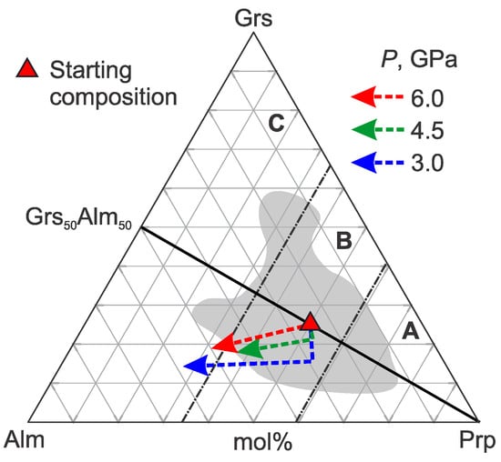 Diagram of the composition of garnets from eclogites []. The grey area shows the field of garnets from eclogite xmenoliths from Udachnaya kimberlite pipe (Yakutia, Russia). The eclogitic garnets of Groups A, B, and C according to the classification of Taylor and Neal (Taylor and Neal, 1989). The black solid line shows the cross-section taken to calculate the T-X diagrams. The red triangle is the starting composition of Prp50Grs25Alm25 garnet. The dotted lines with the arrow show the change in the composition of garnet in the field of partial carbonation with decreasing temperature.