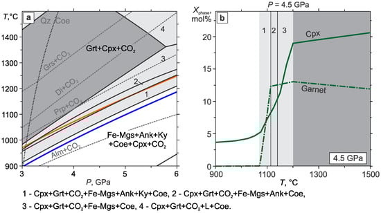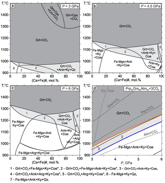 T-X diagrams and P-T pseudo-sections were calculated using the Perple_X v. 7.1.3 software package [] in the range of 900–1500 °C and 3–6 GPa. The calculations were carried out for the CaO-MgO-FeO-Al2O3-SiO2-CO2 system (+Na2O when modeling eclogite) with component ratios corresponding to reagents in carbonation reactions taken in equal proportions (i.e., Grt+3CO2 and Cpx+2CO2). The calculations were performed for the following subsystems: (1) Prp–Grs+CO2, (2) Prp–Alm50Grs50+CO2, and Prp50Grs25Alm25+Di70Jd30+5CO2. For the mineral component, the database from Holland and Powell [] was used with compatible solution models: the Gt(HGP) model for garnet (pyrope-grossular-almandine) []; Omph(HP) for a clinopyroxene (diopside-jadeite-hedenbergite-Ca-tschermak) [,], oCcM(EF) for a ternary solution of calcite–magnesite–siderite, and LIQ(EF) for a carbonate melt []. For CO2 fluid we use compensated Redlich–Kwong (CORK) EOS from Holland and Powell [] who extended the modified Redlich–Kwong (MRK) EOS to 5 GPa and 1600 °C. Calculations were performed with the default resolution values since they did not cause significant distortions in the diagrams. Minimization was conducted on a 4-level grid with 40 × 40 nodes, which had a spacing of 9.6 MPa (0.0096 GPa) at 1.9 °C and with 0.3 mol%. The equations of states of a ternary solution of calcite–magnesite–siderite carbonates oCcM(EF) and a carbonate melt LIQ(EF) are both based on the experiments at 3.5 GPa in CaCO3-MgCO3-FeCO3 system [].