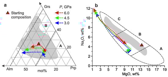 Calculated garnet (a) and clinopyroxene (b) compositions in the Prp50Grs25Alm25+Di70Jd30+5CO2 system at 3, 4.5, and 6 GPa compared with the eclogitic garnet and clinopyroxene of Group A, B, and C, according to the classifications of Coleman et al. [] and Taylor and Neal [], respectively. The ranges of eclogitic garnet compositions (light-grey area) and omphacite (light-grey area) correspond to those of Taylor et al. []. The dotted and solid lines with the arrow show the change in the composition of garnet (a) and clinopyroxene (b) in the field of partial carbonation and the eclogite–CO2 field, respectively, with decreasing temperature. The red triangles are initial compositions of garnet and clinopyroxene.