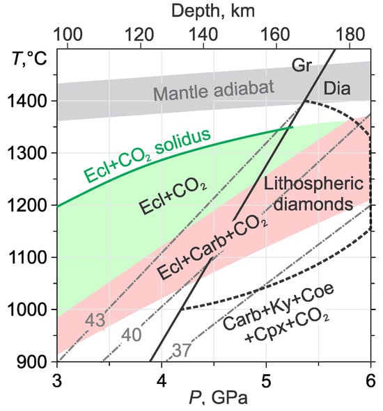 Phase relationships in the system of eclogite–CO2 according to thermodynamic calculations. The P-T fields of CO2 fluid stability in the eclogitic suite and partial carbonation of eclogite are shown in grey and pink, respectively. The green line is the solidus of the system of eclogite–CO2 taken from Yaxley and Brey []. Gr/Dia—graphite-to-diamond transition []. Dash-dotted lines—continental geotherms (37, 40, and 43 mW/m2) after Hasterok and Chapman []. Mantle adiabat (light grey) is taken from []. The dotted line delimits the P-T range of lithospheric diamond formation.